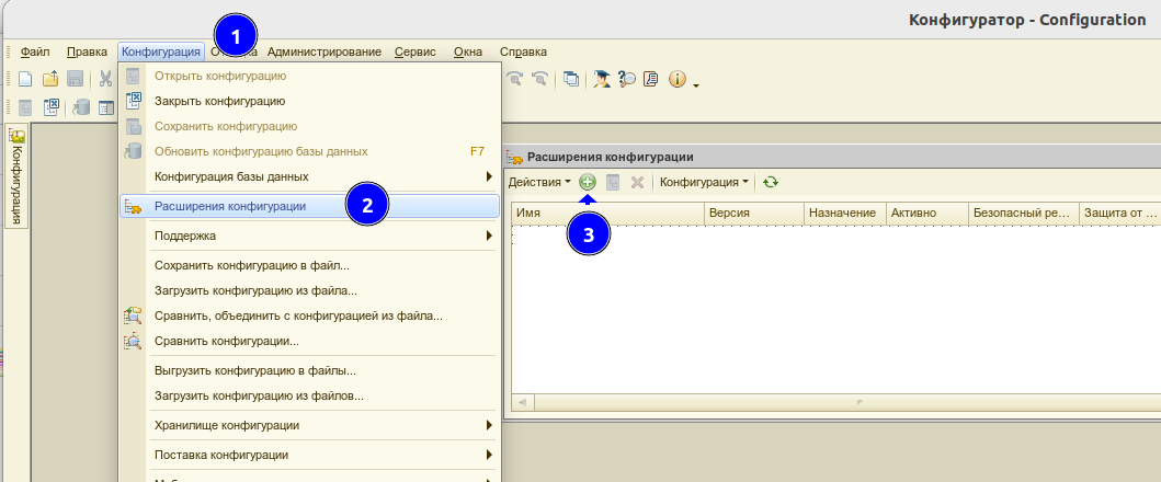 Откройте список расширений: В меню выберите "Конфигурация" → "Расширения конфигурации".